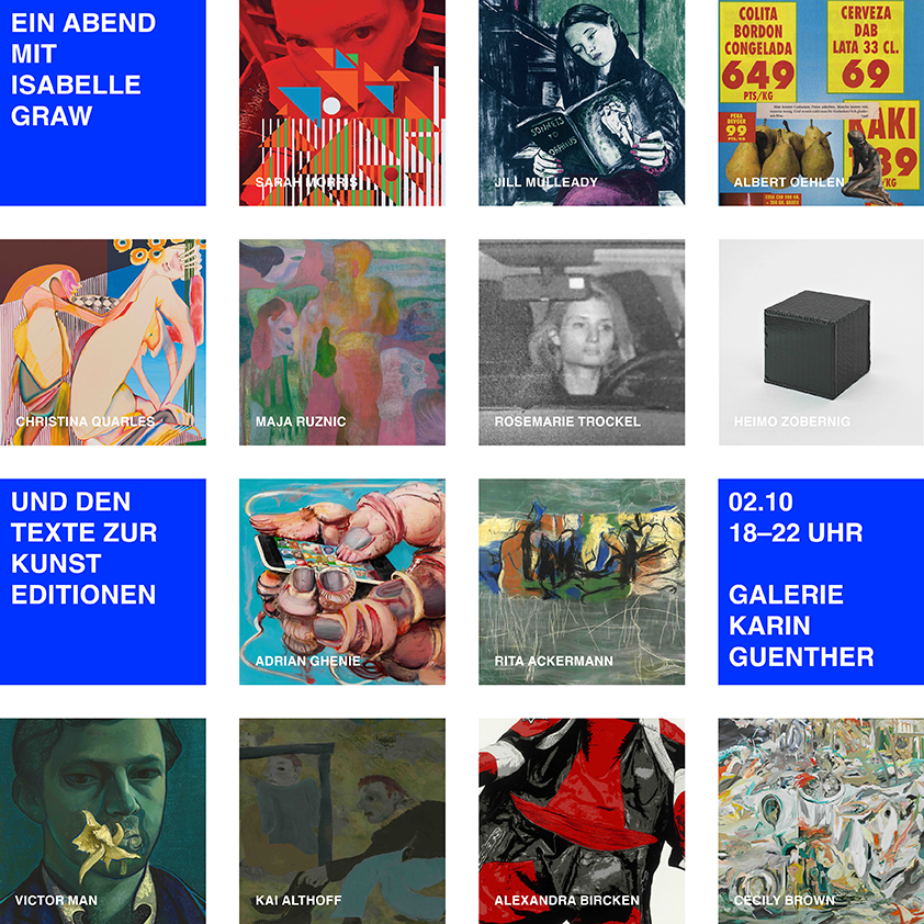 Begleitend werden Editionen von TEXTE ZUR KUNST mit Arbeiten von Rita Ackermann, Kai Althoff, Hernan Bas, Cecily Brown, Alexandra Bircken, Sarah Morris, Albert Oehlen, Gerhard Richter, Ed Ruscha, Rosemarie Trockel u. v. m. – die an diesem Abend erworben werden können.